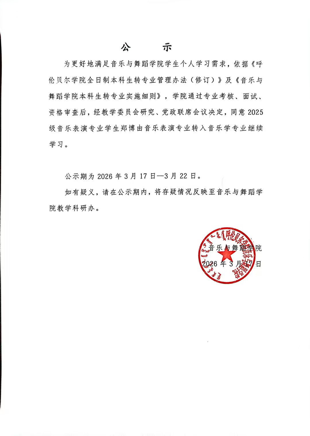 音乐与舞蹈学院2026年度学生转专业结果公示