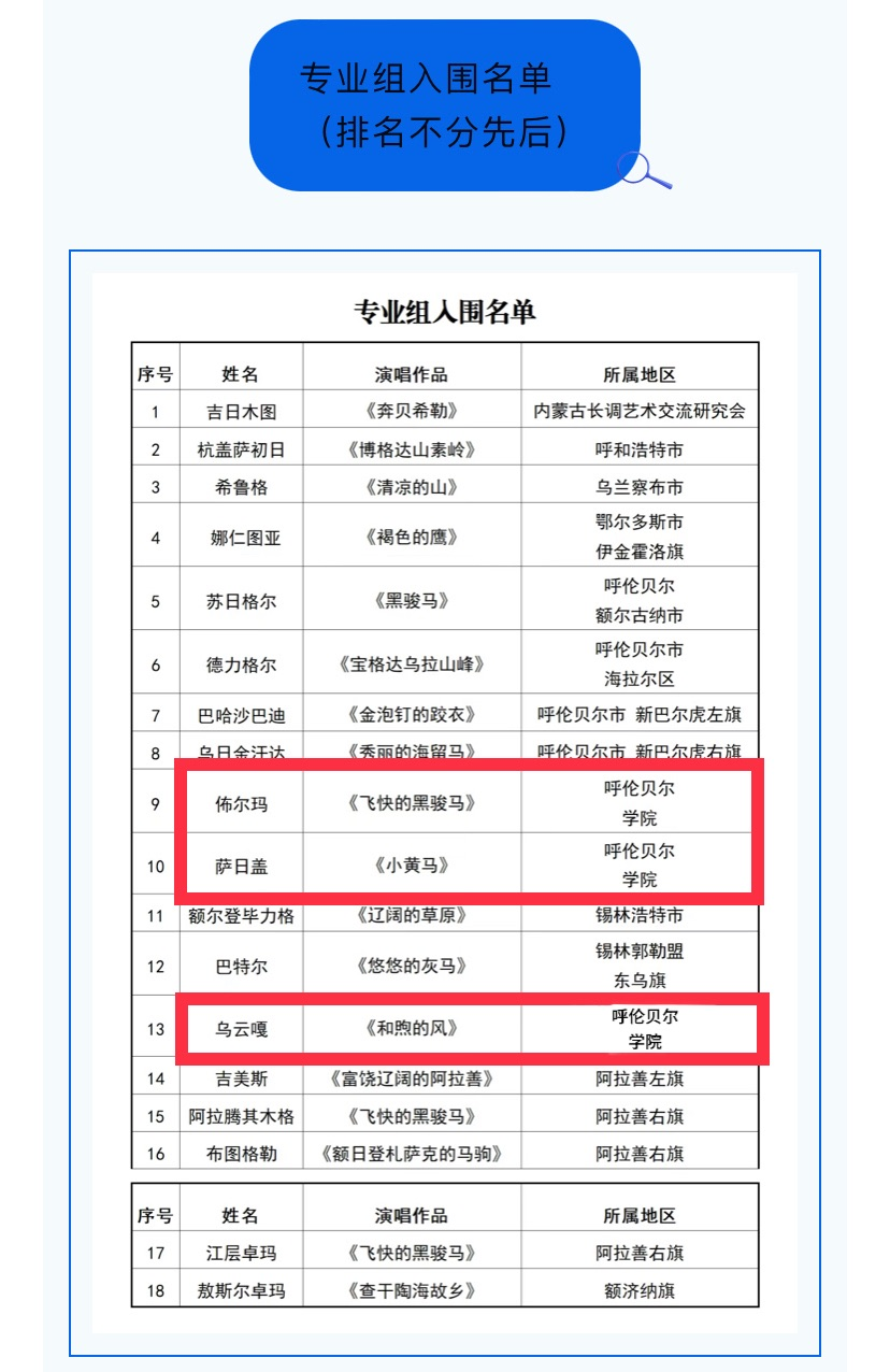 作为以国家级非遗代表性传承人“鲁·巴德玛”命名的品牌赛中,经过严格的评审,全国共有62名选手入围决赛,巅峰对决即将于阿拉善金色胡杨音乐厅上演。我校参赛学以《飞快的黑骏马》《小黄马》《和煦的风》等经典民歌参加专业组。三位同学不负众望,凭借稳定的发挥与出色的综合表现,将长调民歌的细腻悠远与草原意境演绎得淋漓尽致。评委组对学子们扎实的唱功、精准的风格把握及真挚的情感表达给予高度评价,认为其展现了专业艺术教育的丰硕成果与长调传承的新生活力。